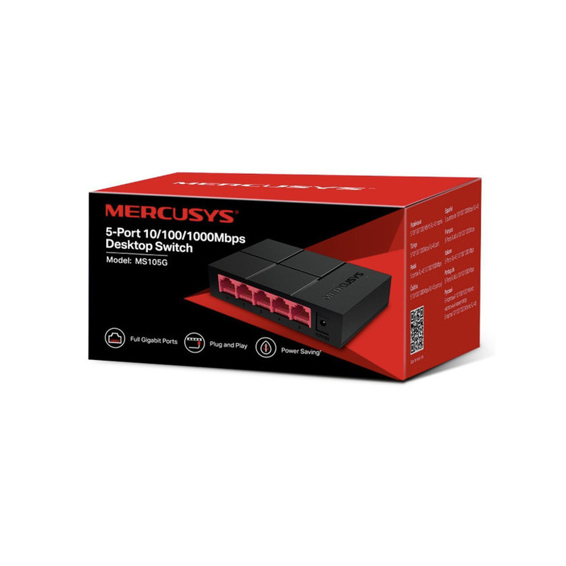 O Mercusys MS105G é um switch Gigabit de 5 portas que oferece conectividade rápida, estável e eficiente para ambientes domésticos e pequenos escritórios. Com suporte para transferência de dados em velocidades de até 1000 Mbps e largura de banda de comutação de até 10 Gbps, garante desempenho fiável para TVs 4K, computadores, impressoras, câmeras IP e consolas de jogos.